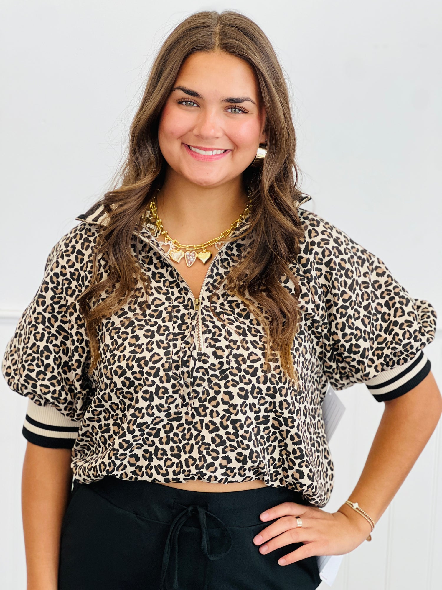 Introducing the super cute on trend pullover Taupe Leopard Half Zip Blouse. Features include short puffed sleeves, half-zip closure, neutral multi-colored striped banded collar and cuffs. Unlined. Woven. Non-sheer. Lightweight.