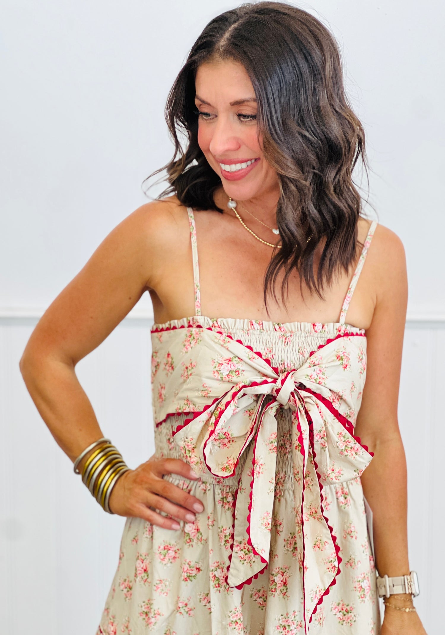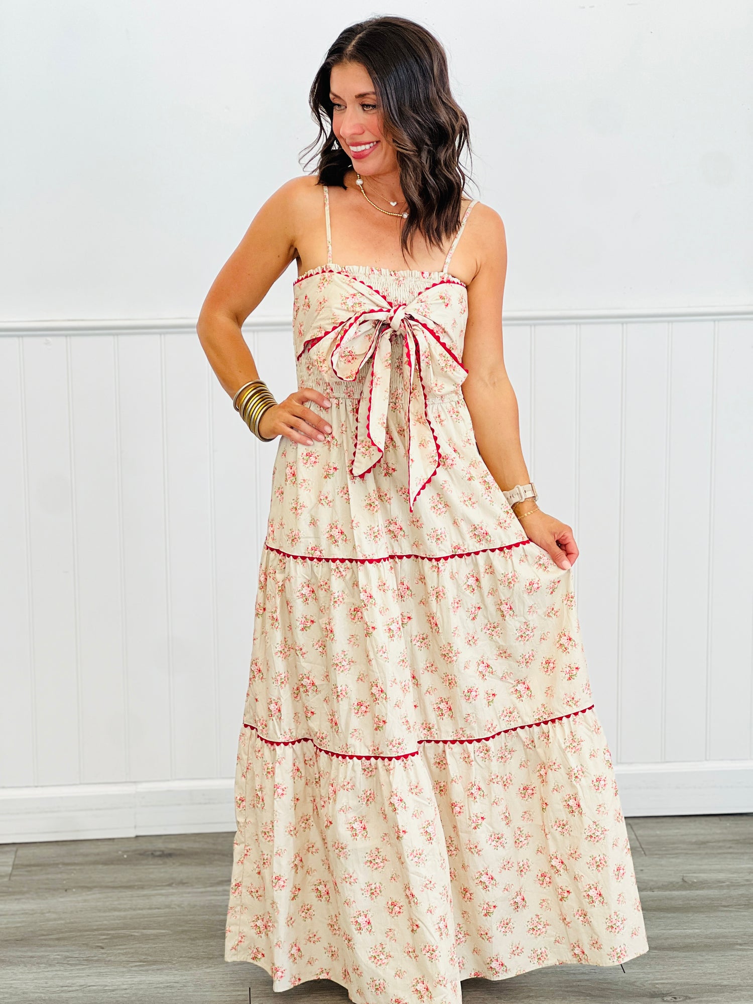 Introducing the precious Taupe/Red Ric Rac Front Tie Maxi Dress. With its adjustable spaghetti straps, square neckline, front sash tie across bustline, side zipper closure, side pockets, smocked back and tiered flowy silhouette with contrast binding, you'll feel pretty and fashionable at any event. Floral print cotton fabrication.