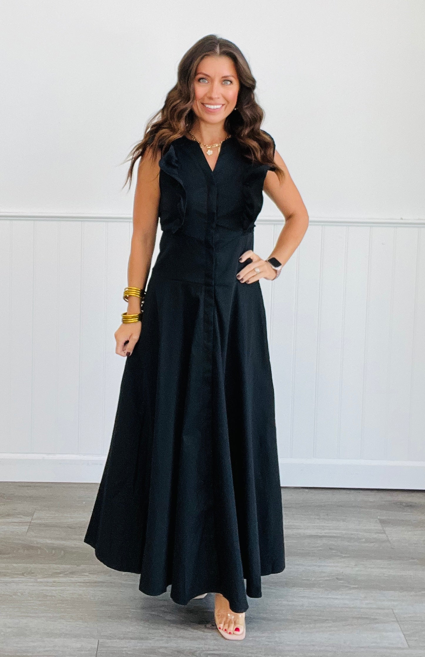 Black Ruffled Power Shoulder Maxi Dress (Reg)