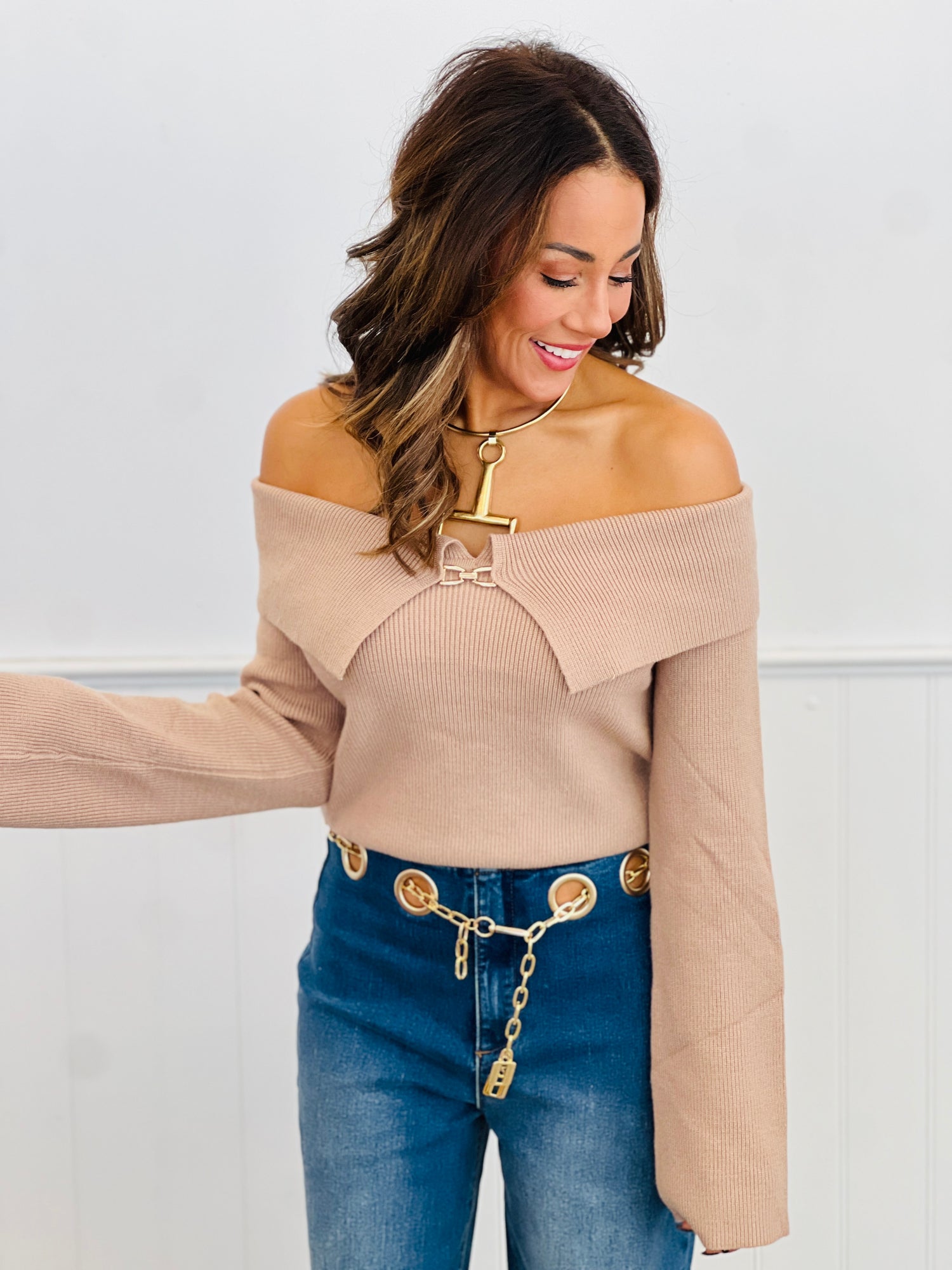 Wrap yourself in cozy charm with the Taupe Shawl Collar Sweater Top! Crafted from soft sweater knit, it features a chic shawl collar accented by a fun gold metal detail for a touch of sparkle. This top is perfect for adding a playful twist to your casual wardrobe while keeping you comfortably stylish.