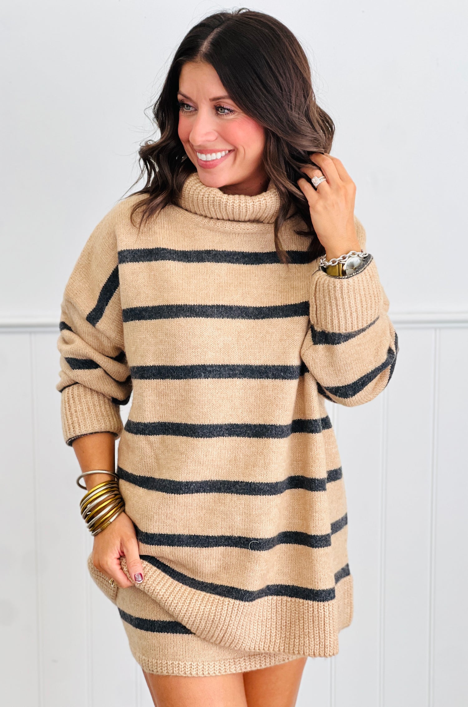 Step up your game with our Taupe Striped Turtleneck Sweater & Mini Skirt Set! This cute and cozy set features a long sleeved sweater with a turtleneck and matching mini skirt.