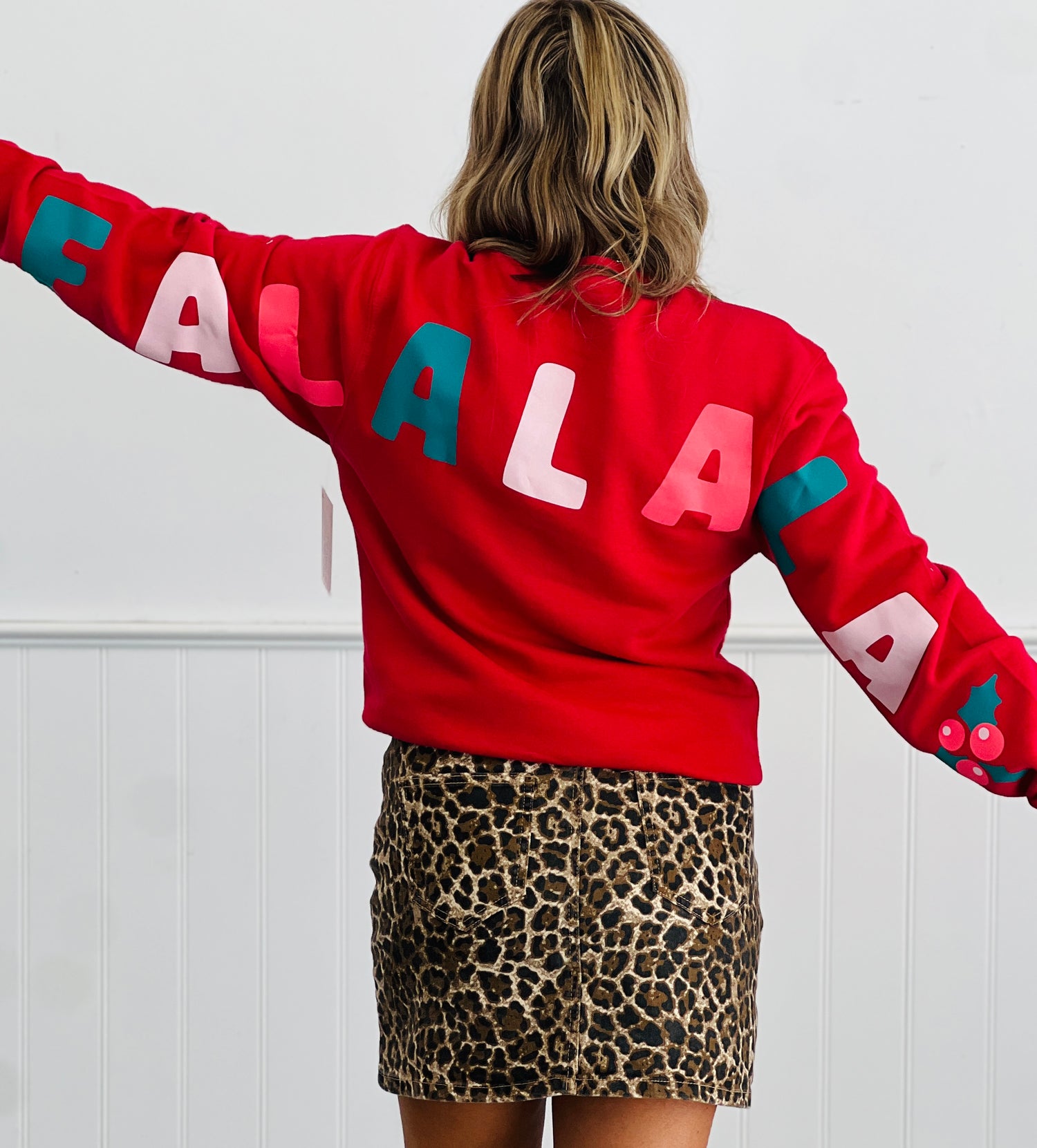 Spread holiday cheer in this vibrant red crewneck sweatshirt! The front features "tis the season" in crisp white lettering, while the back showcases a festive "Fa La La La" in cheerful pink, green, and white. Perfect for getting into the spirit, this cozy long-sleeve style works for everyone with regular and plus sizing options. Your new favorite seasonal staple awaits!