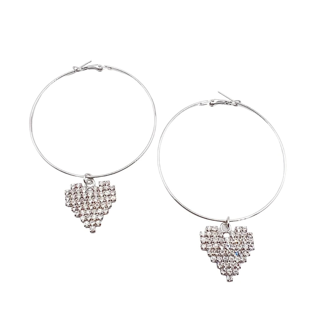 Shine bright with these large gold or silver hoop earrings featuring clear (silver) crystals or AB (gold) crystals studded heart dangle. Embrace your playful side and add these delightful hoops to your jewelry collection today!