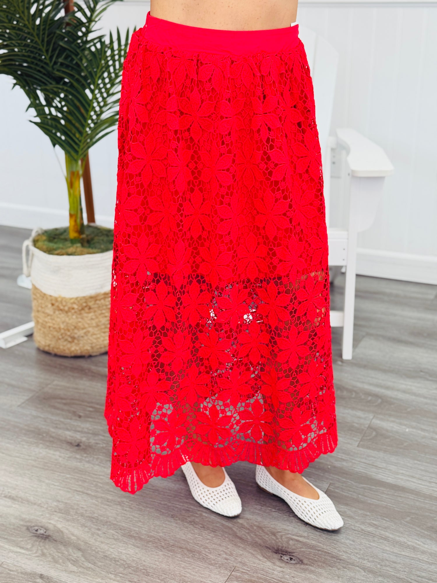 Tomato Red Lace Scalloped Midi Skirt (Reg.)