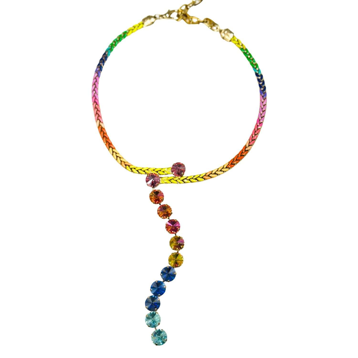 Add a splash of color and charm to your look with the TOVA - Selina Y Necklace. This playful piece features an antique gold braided chain coated in vibrant rainbow enamel, forming a stylish Y shape. Dangling from the chain is a 5-inch drop of dazzling rainbow ombre crystals that catch the light beautifully, making every outfit pop with fun and flair. Perfect for those who love a touch of whimsy and sparkle!