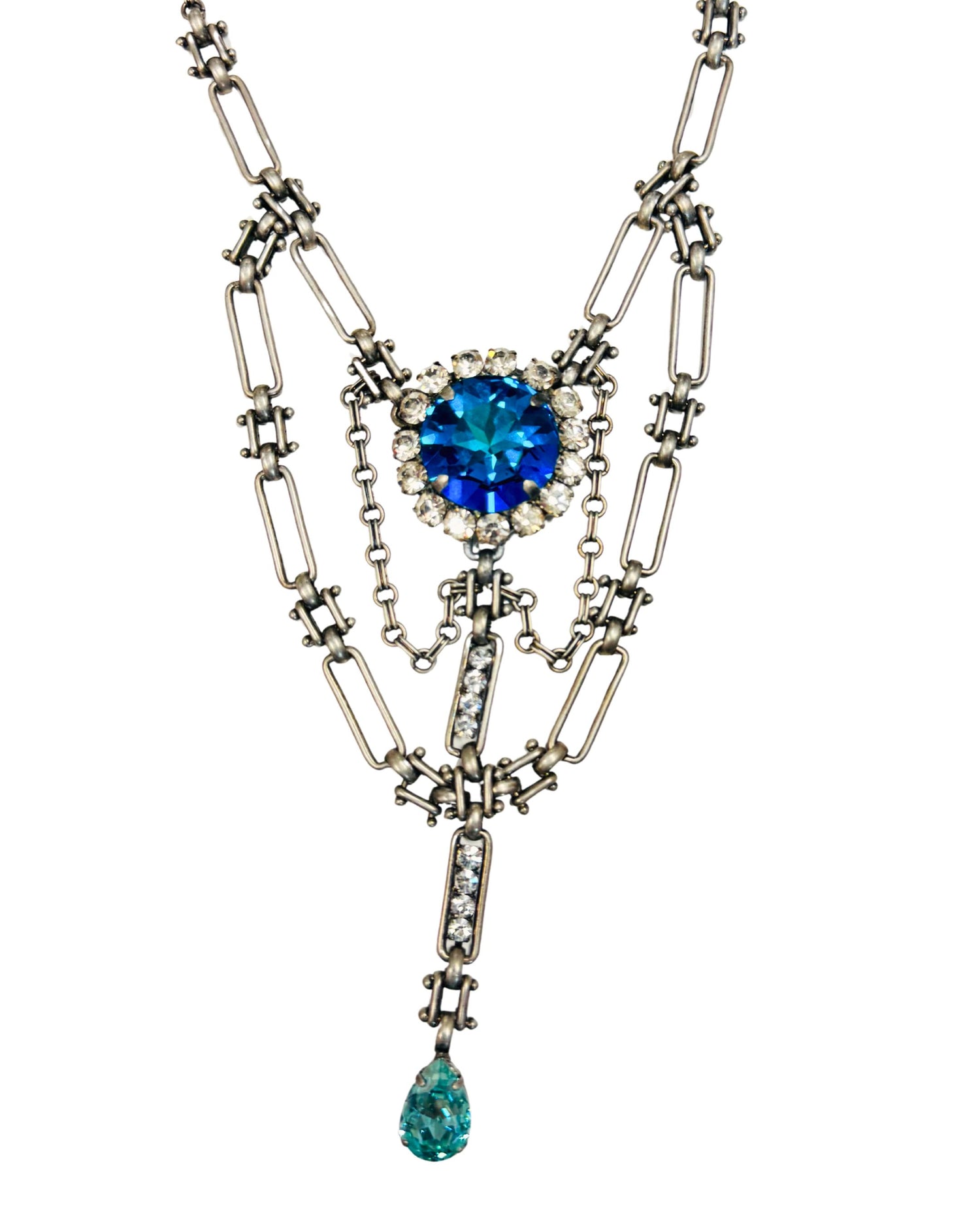 Add a splash of vintage charm to any outfit with the Elizabeth Necklace in Antique Silver. Featuring a delicate silver chain accented by connecting links, this playful piece centers on a large, round blue jewel pendant surrounded by sparkling clear accents. It’s the perfect statement accessory to brighten your day with a touch of timeless elegance and fun.