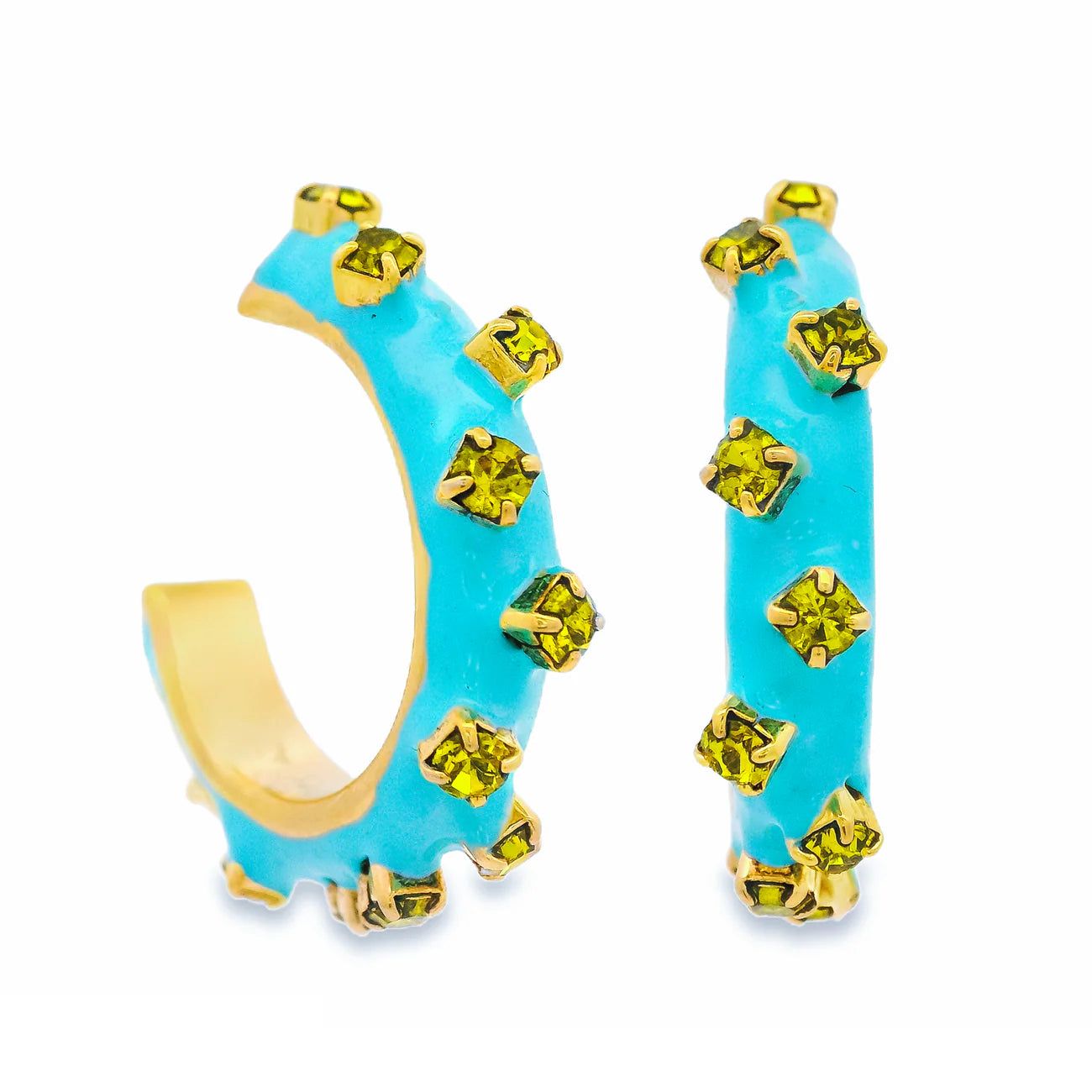 Add vintage charm with Melina Hoops! These 0.75" Antique Gold plated earrings sparkle with hand-painted enamel and crystals. Hypoallergenic and comfy, made in Canada. Available in three fun colors!