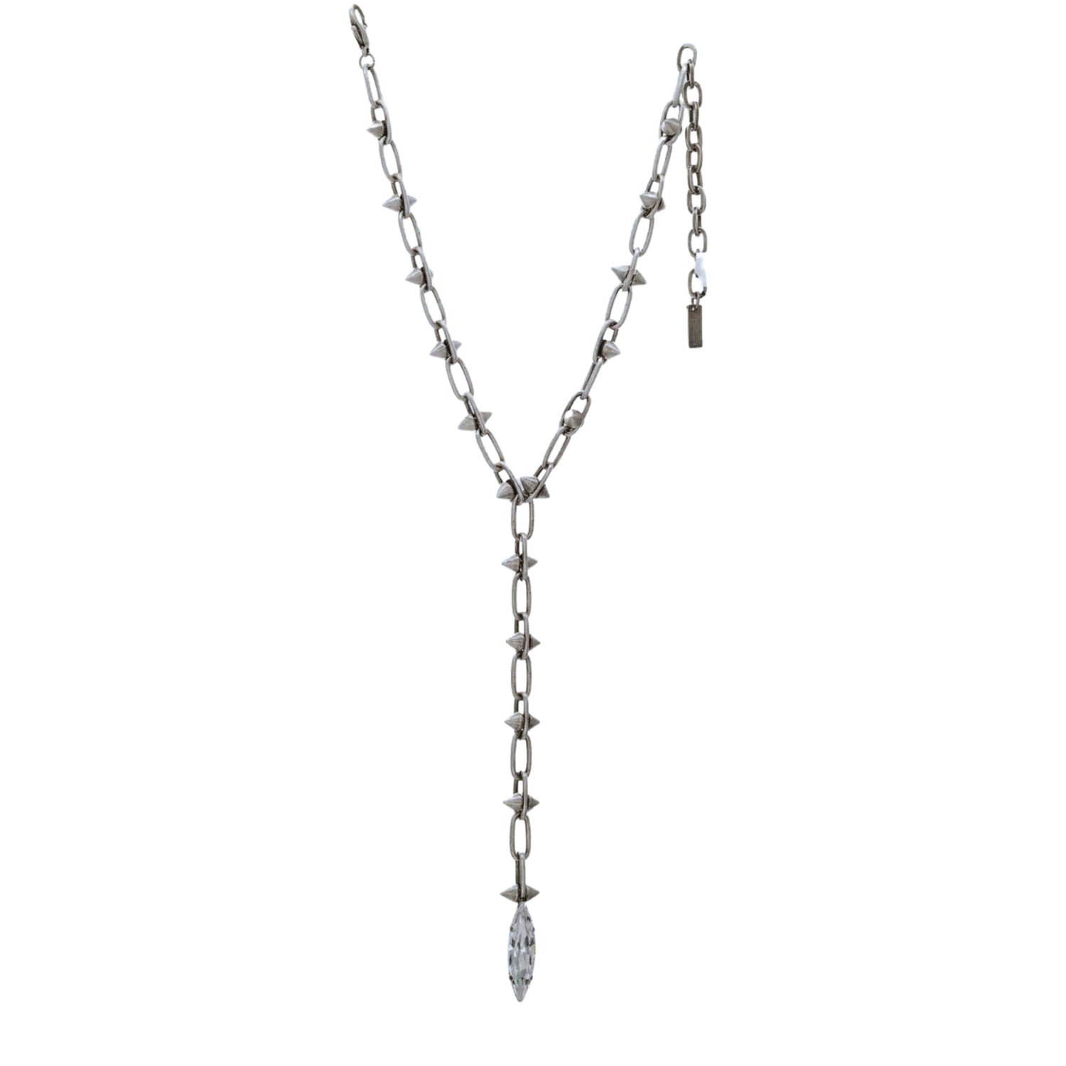 Introducing The Milan Necklace—where edgy meets elegant! This antique silver stunner features a bold spike stud chain that commands attention, topped with a gorgeous sparkling marquis crystal that catches light from every angle. At 7" drop, it's the perfect length to layer or wear solo for maximum impact. Whether you're dressing up or adding attitude to your everyday look, this necklace delivers serious sparkle with an undeniable edge.