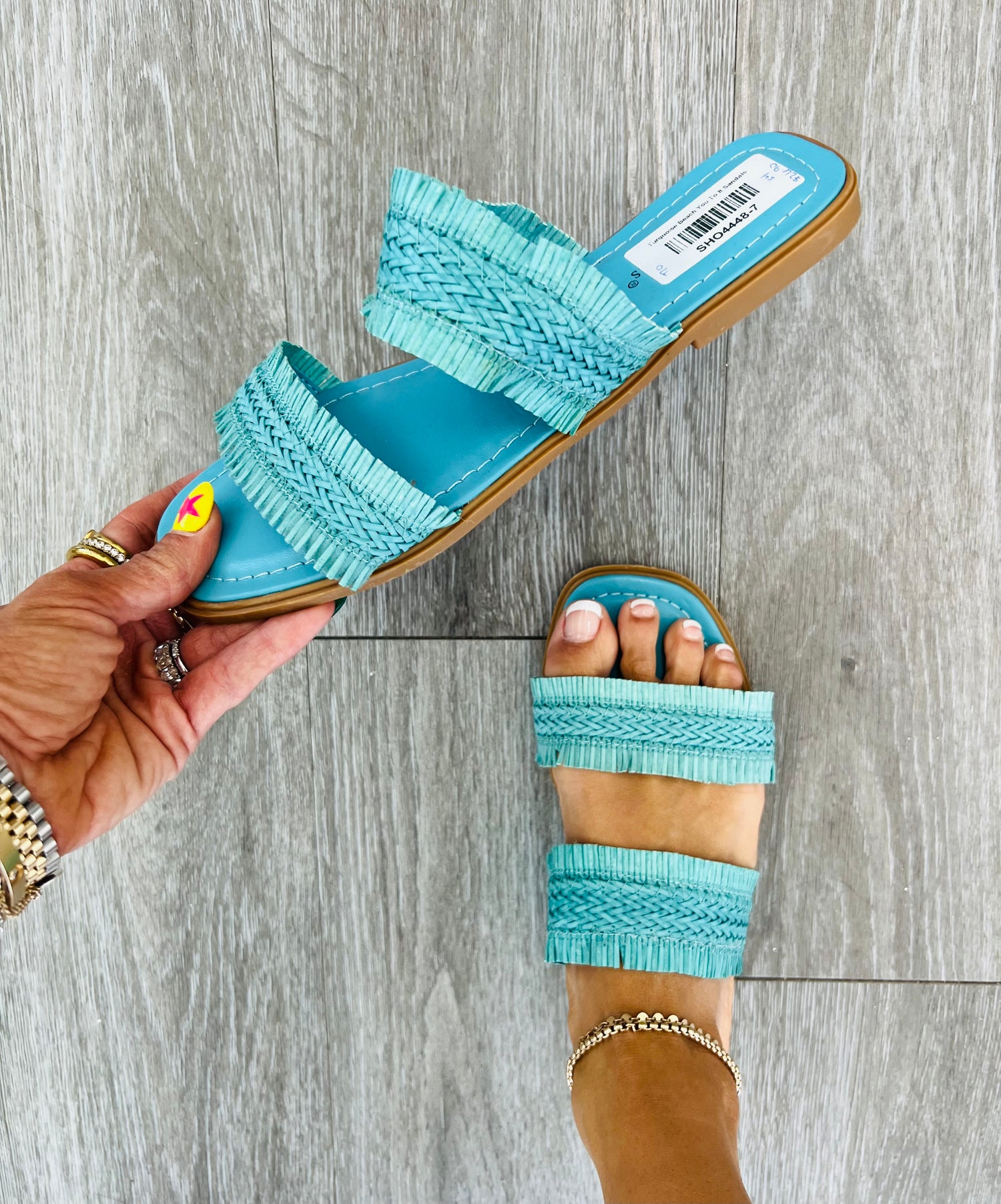 Step right into the beach with our Turquoise Beach You To It Sandals! These playful white sandals feature double bands with woven detailing, making them perfect for any summer adventure. Slip them on and let the fun begin!