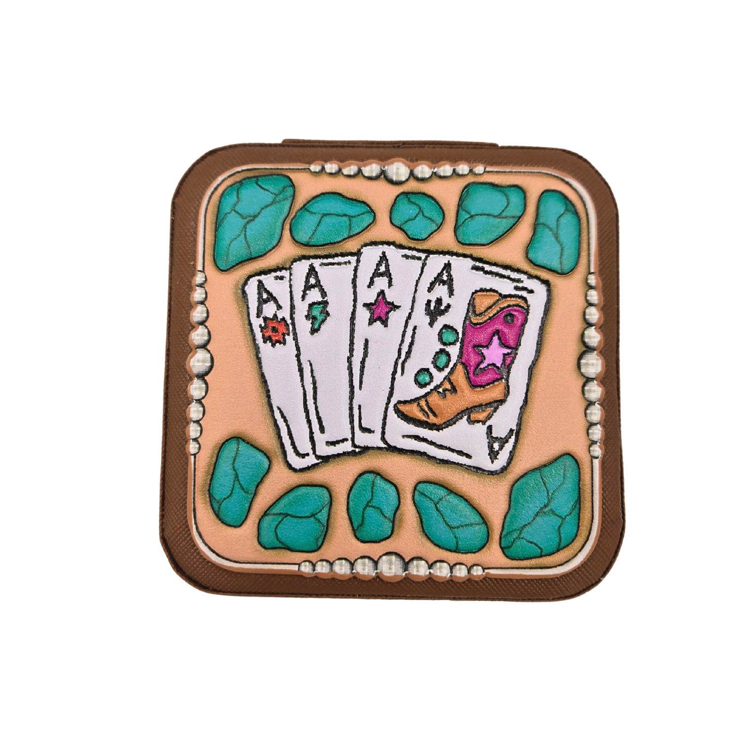 Shuffle up your accessory game with this one-of-a-kind jewelry box! Featuring a rich brown finish adorned with turquoise stone decals and a cheeky four-of-a-kind Ace card design, it's the perfect blend of luck and style. Store your favorite rings, necklaces, and trinkets in a box that's as much conversation starter as it is functional. A winning hand for any jewelry lover who appreciates a little personality with their storage.