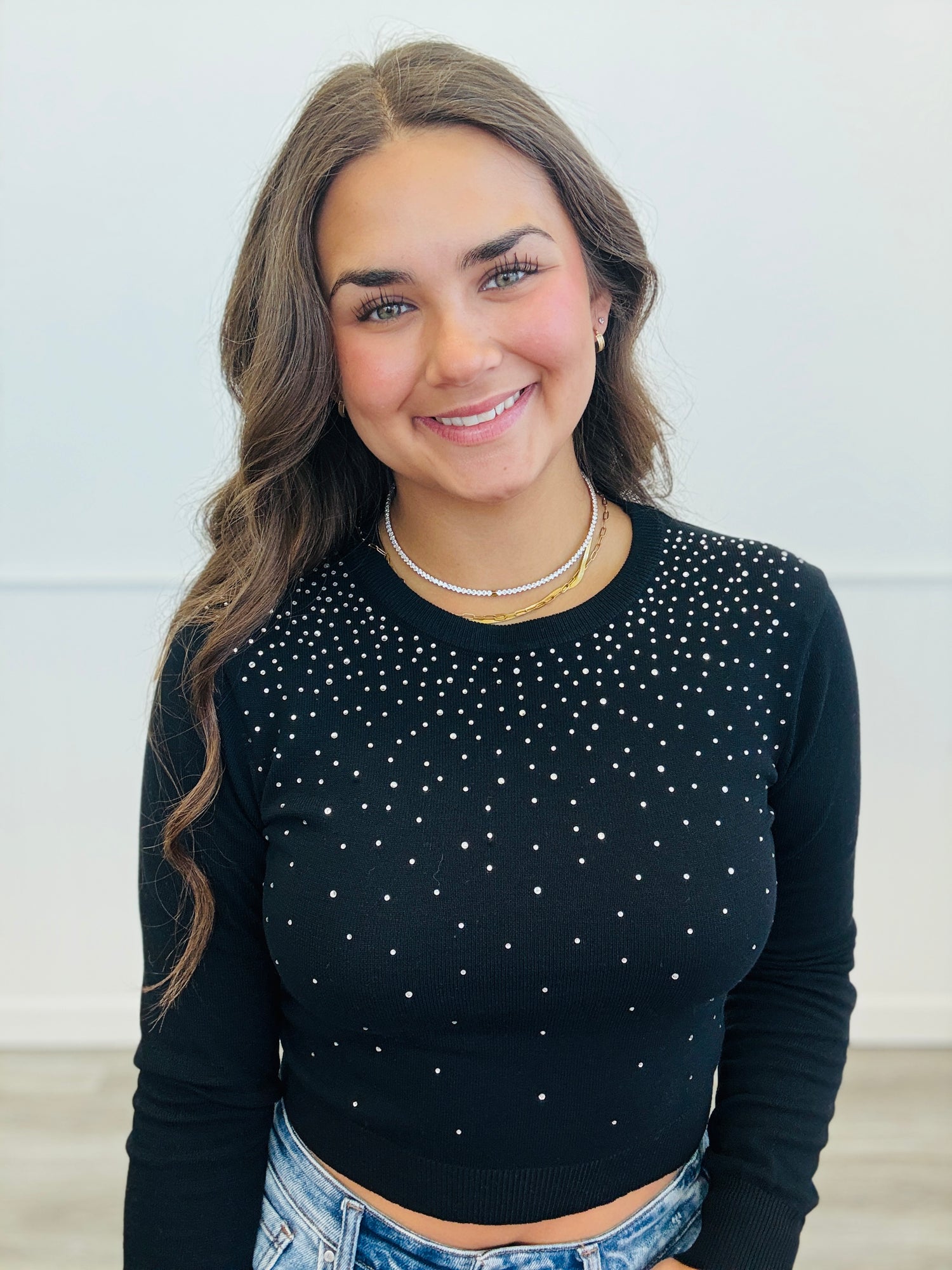 Elevate your sweater collection with our Rhinestone Embellished Sweater Top. Featuring long fitted sleeves, round neckline, contemporary waist length fitted silhouette and rhinestone embellishment across the entire bodice.