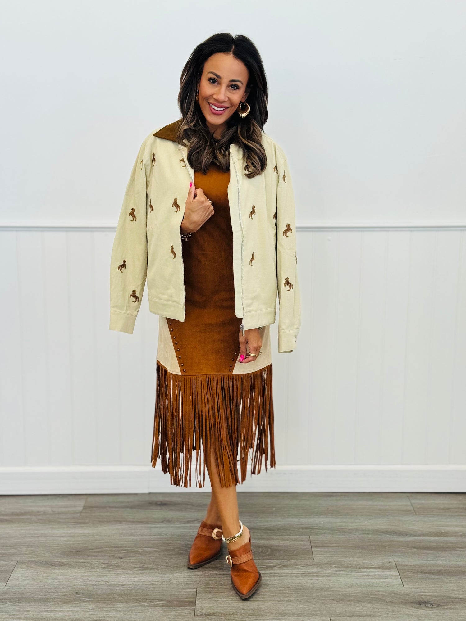 Introducing the super cute golden brown and cream Two Tone Suede Studded Fringe Midi Dress! Western-inspired midi dress featuring soft faux suede fabric with contrast paneling. Designed with studded trim along the seams and a fringe hem for a bold statement look. Back zipper closure. Perfect for styling with boots and accessories.