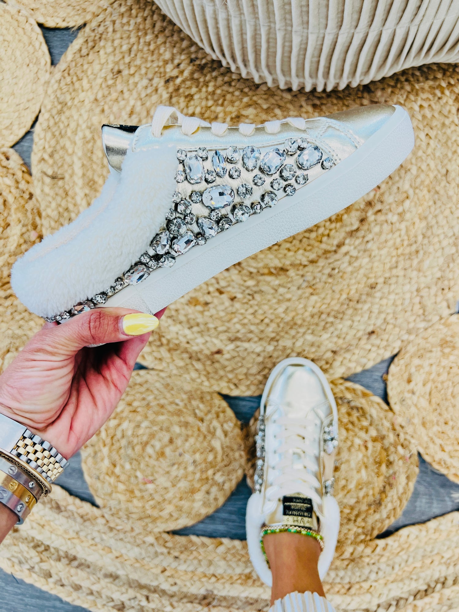Cozy up in style with these gold, leather, sherpa-lined, slip-on sneakers, sparkling with dazzling crystals for a touch of fun and glam. Exclusively at Walker Rose Boutique!