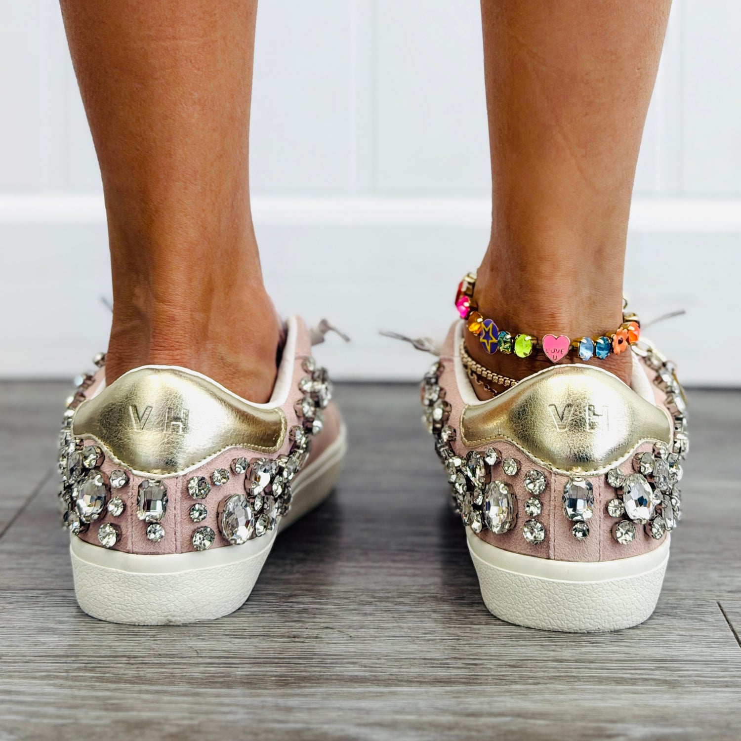 Elevate your sneaker game with the exclusive VH x WR Pretty In Pink Sneakers, a stunning collaboration between Vintage Havana and Walker Rose. These eye-catching soft pink suede sneakers feature meticulously hand-stitched crystals that catch the light with every step, creating a truly one-of-a-kind look.