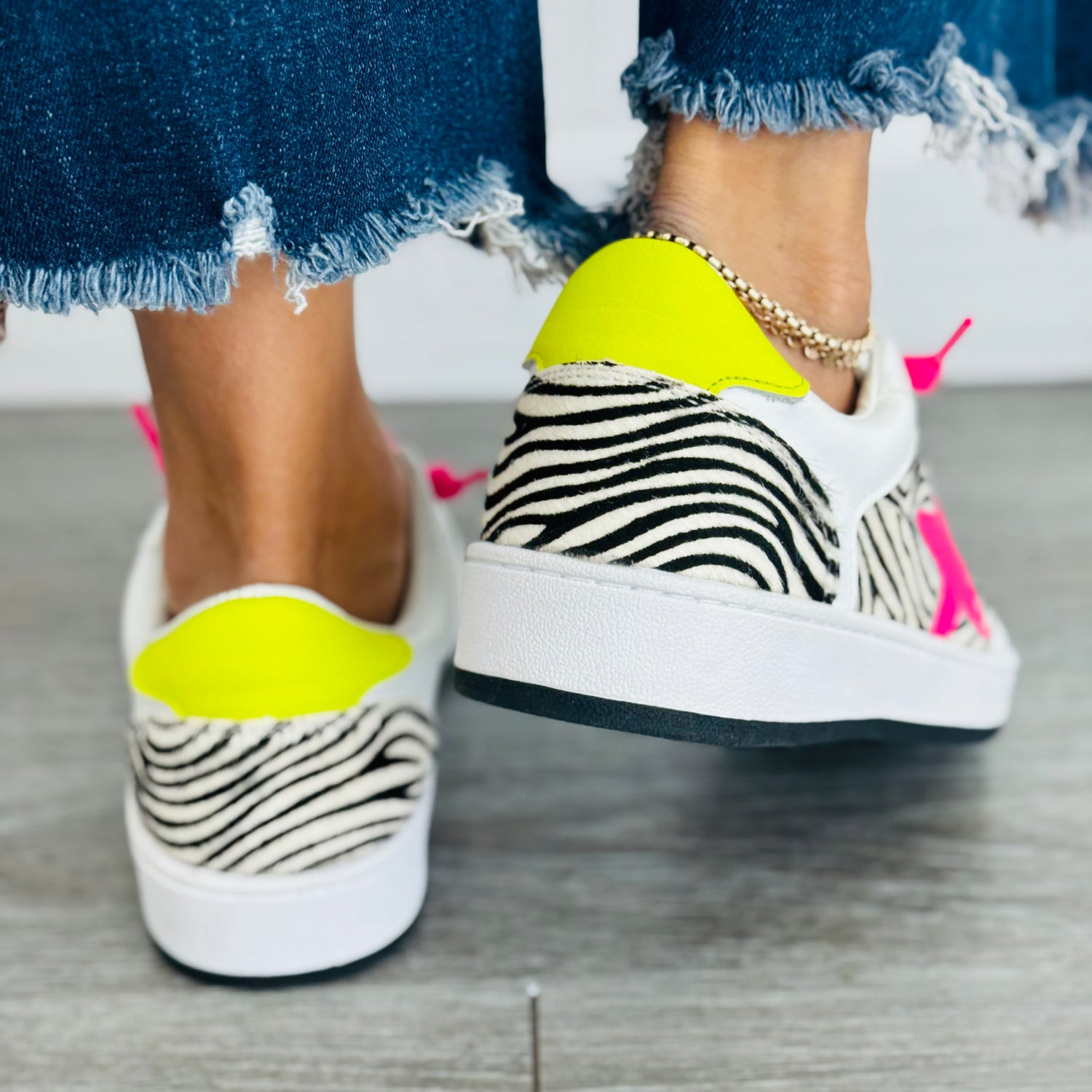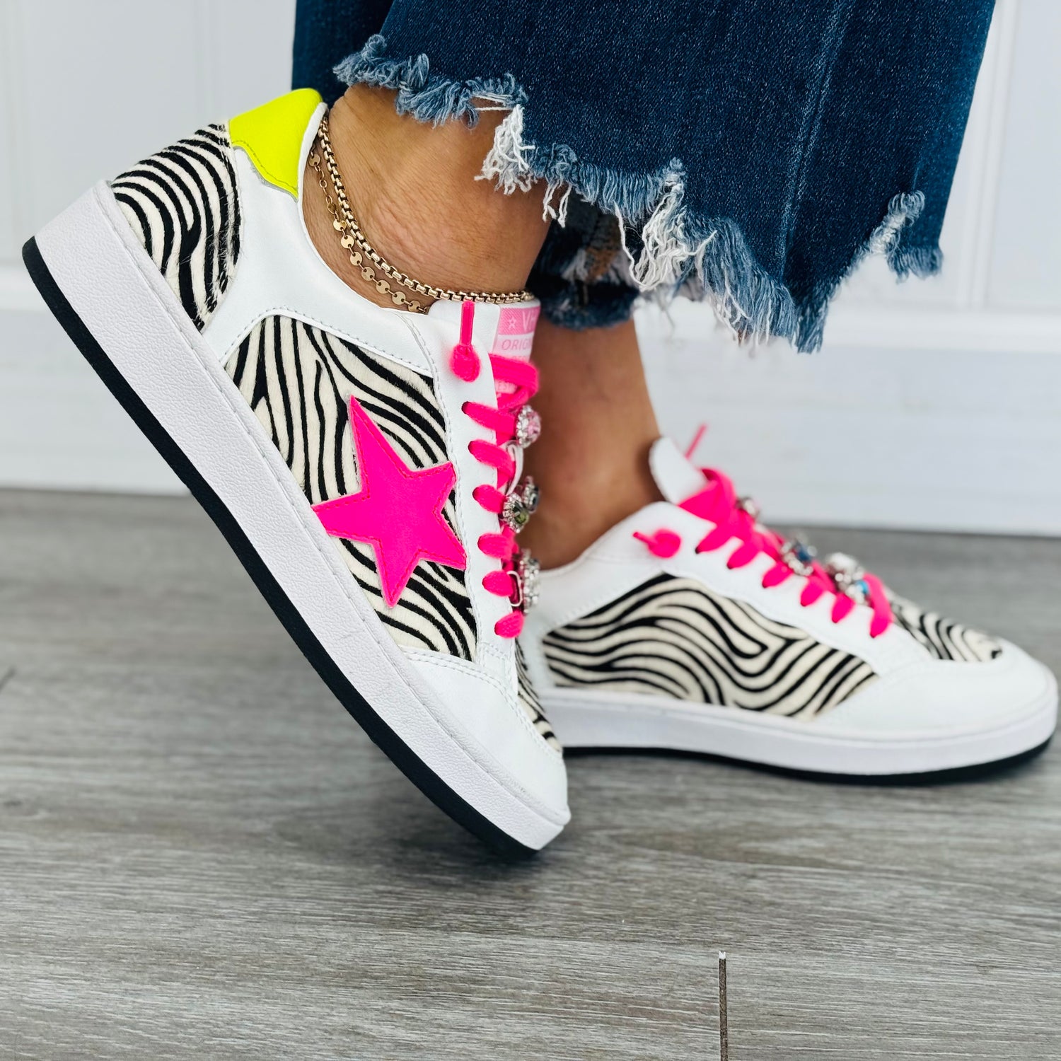 Step into bold style with the VH x WR Neon & Zebra Wild Gem Sneakers. These eye-catching kicks feature a striking faux zebra hair upper paired with vibrant neon yellow and pink accents that demand attention. Sparkling gems adorning the laces add a touch of glamour to every step. Perfect for those who refuse to blend in, these sneakers combine wild prints with playful details for a look that's unmistakably you.