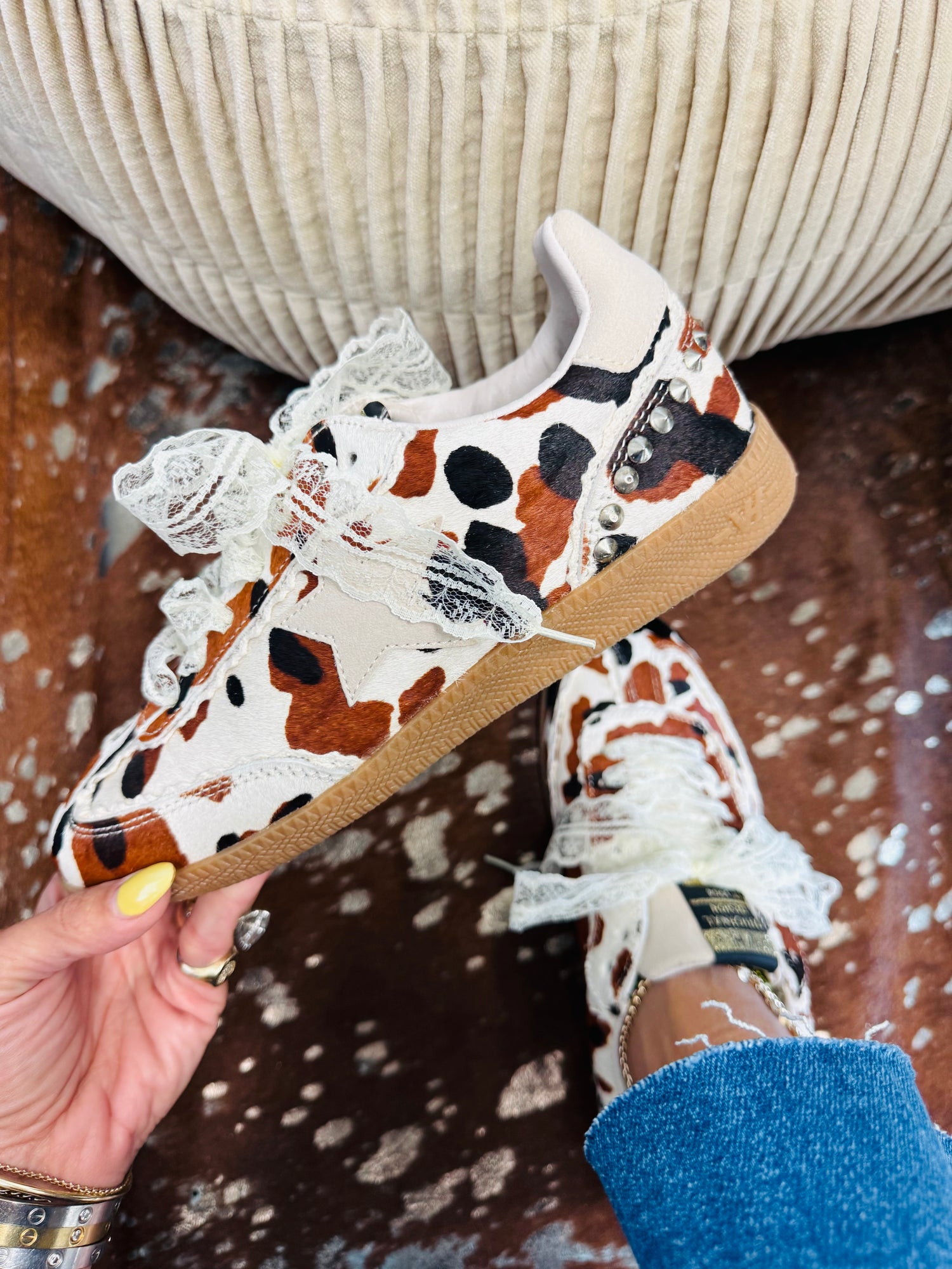 Step out in style with the VH x WR EXCLUSIVE Boho Rodeo Sneakers! Featuring a bold cow print paired with playful lace and edgy stud detailing, these sneakers add a fun, trendy twist to any outfit. Perfect for those who love to stand out while staying comfy on the move. Exclusively available at Walker Rose Boutique!