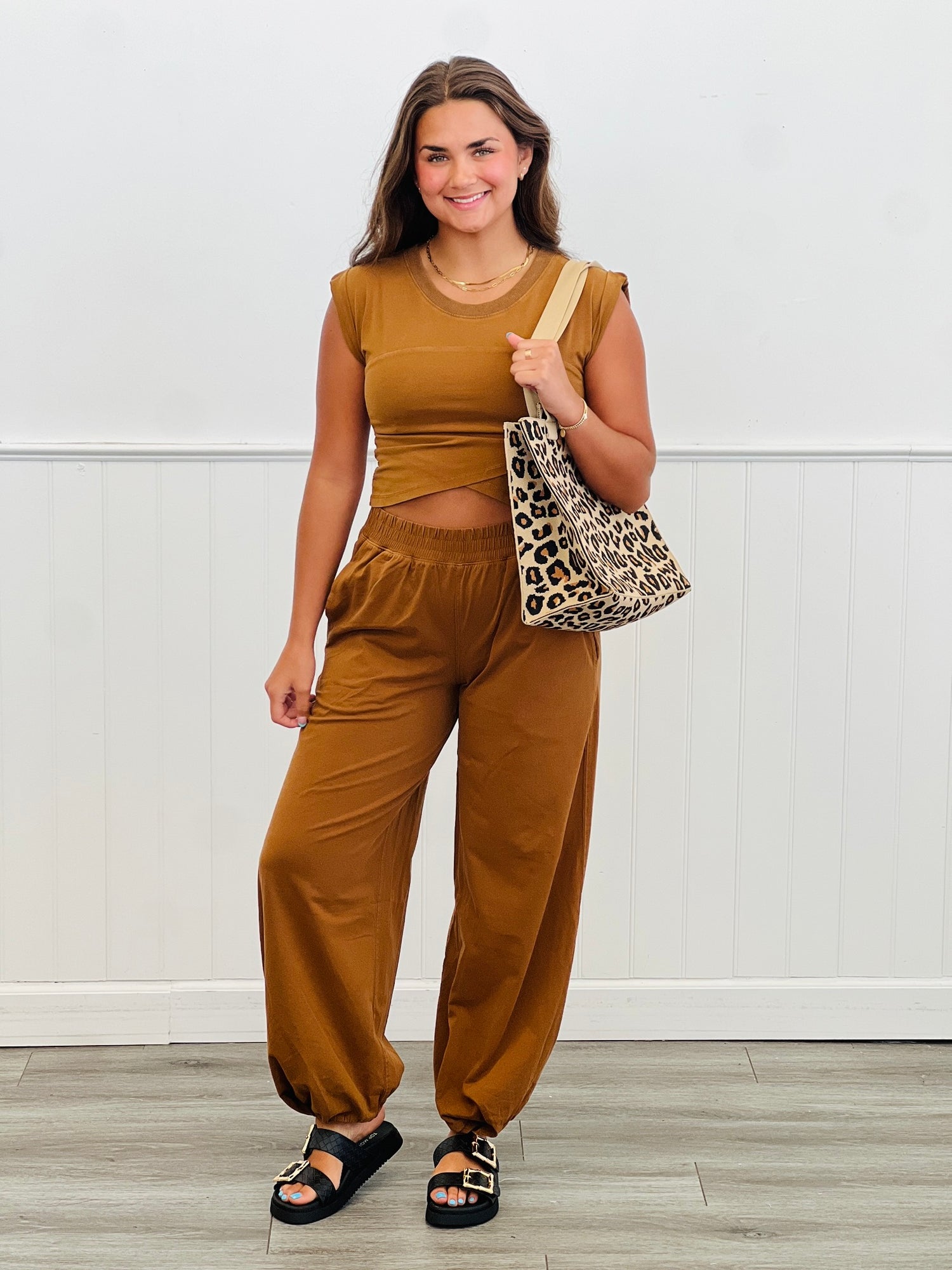 Upgrade your casual game wearing the super cute effortless Walnut Mineral Washed Jogger Pants. These jogger style pants showcase an elasticized waistband for a comfortable fit, practical side pockets, subtle seam detailing, and a straight leg silhouette that tapers into elasticized cuffs for a laid back yet polished look. Perfect match to active tee TOP11267.