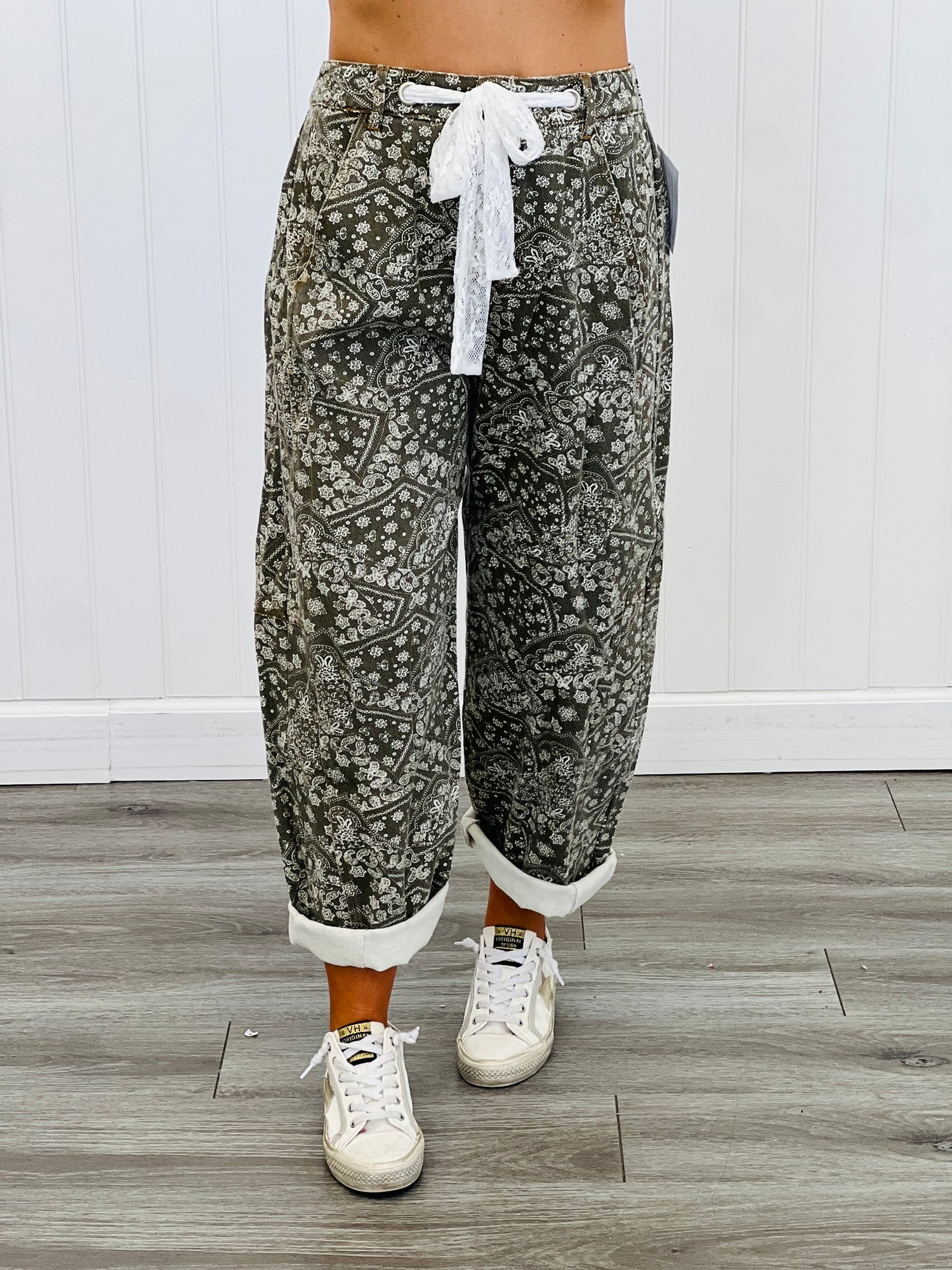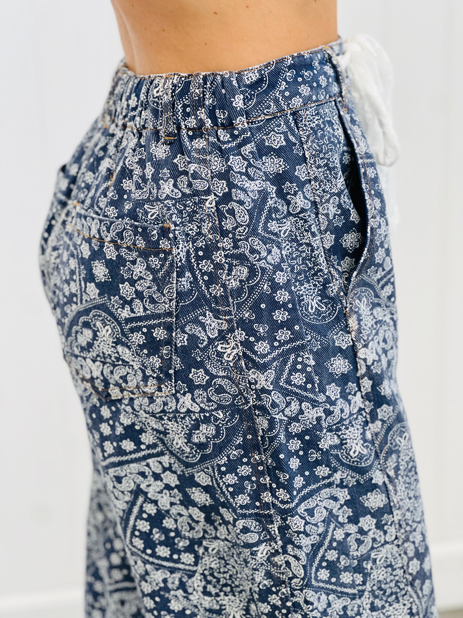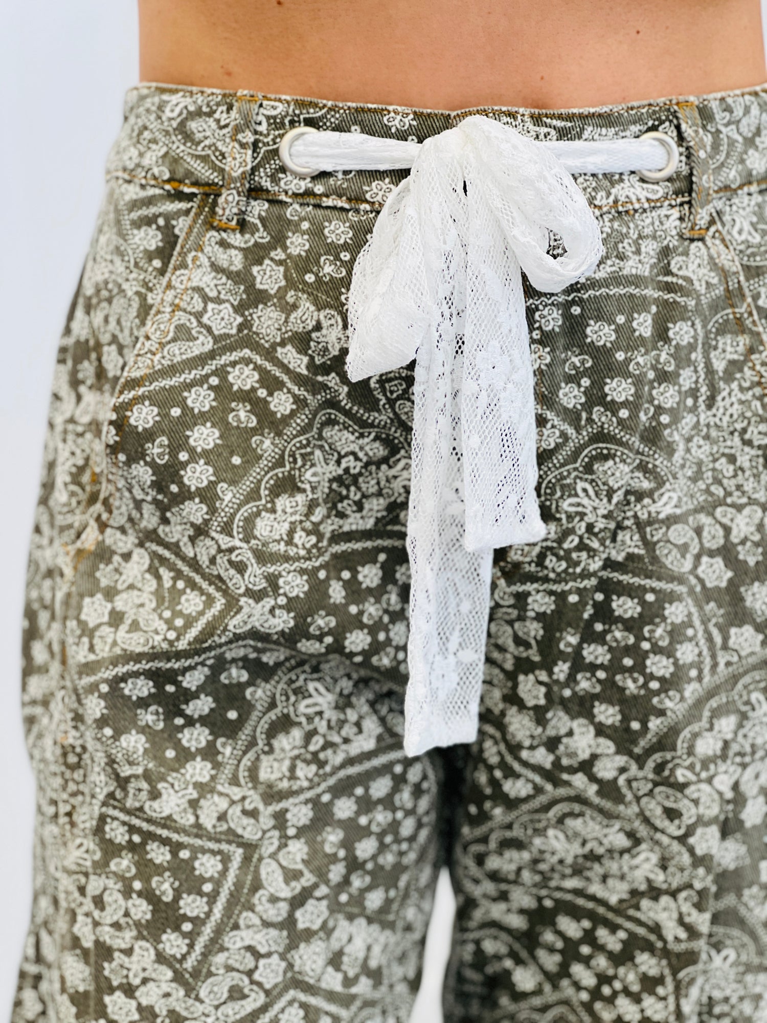 Make a statement in these washed denim paisley printed pants! The lace drawstring adds a touch of femininity to the edgy denim. Available in regular and plus sizes, with 2 color options. Perfect for adding some playful flair to your denim collection.