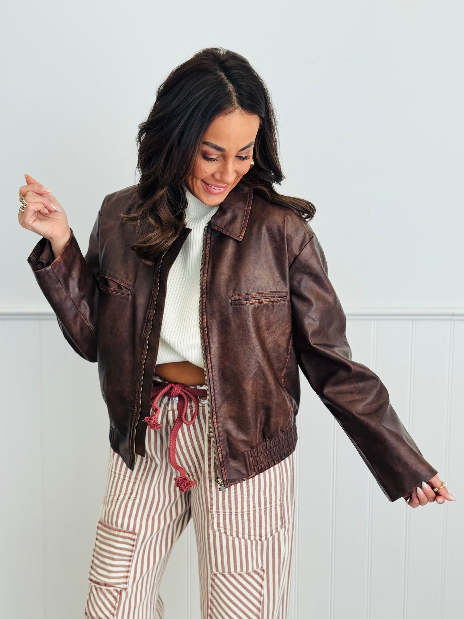 Introducing the fabulous Washed Faux Leather Jacket! This sleek edgy contemporary cut jacket features long sleeves, welt chest pockets, a front zipper closure and an elastic back hem.