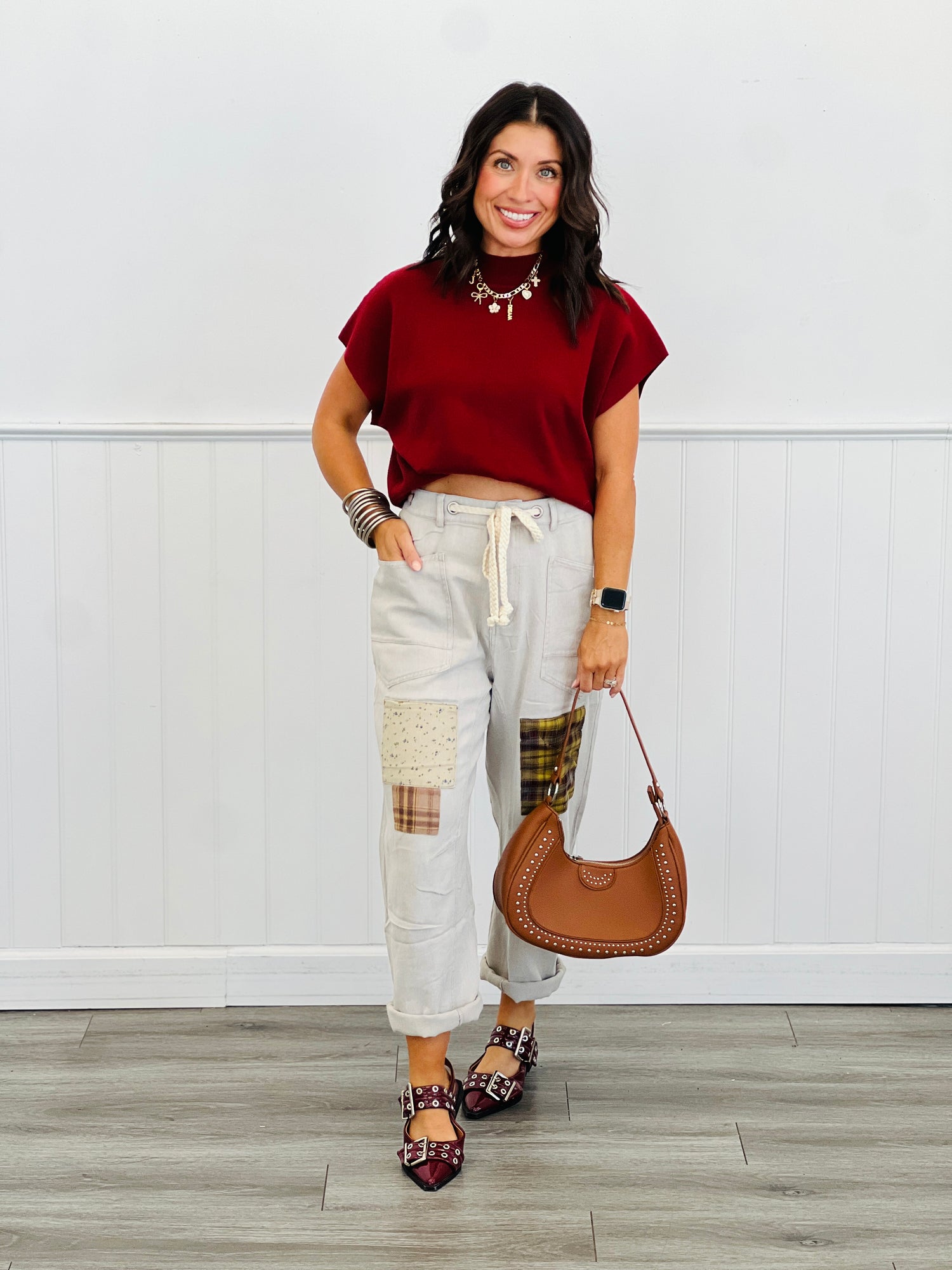 Step into casual style with our Washed Khaki Patchwork Ankle Pants! These bottoms feature a solid fabrication with multi print patches and a flattering cut that adds a trendy element to your wardrobe. With front pockets, front button & zipper closure, braided waist cord belt and straight ankle length legs.