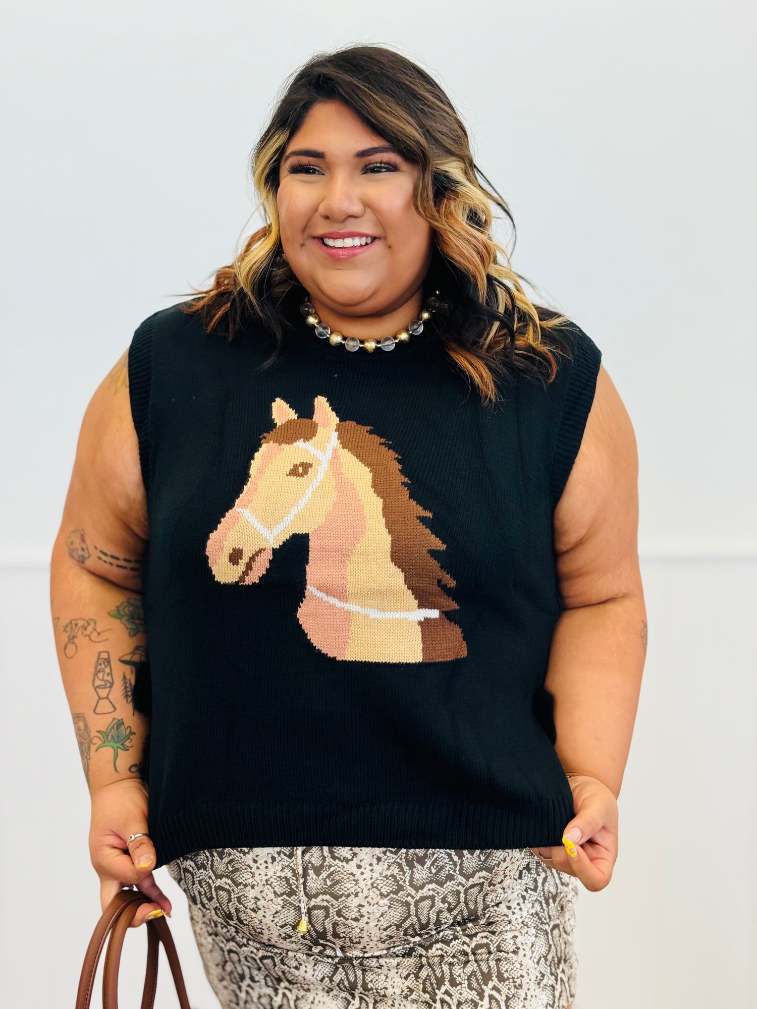 Display your love of horses and all things Western wearing this super cute sleeveless Western Horse Sweater Top! Featuring a crew neckline, extended shoulders, ribbed edges, side tie detail and a large colorful contrast horse graphic on the front. True to size silhouette.