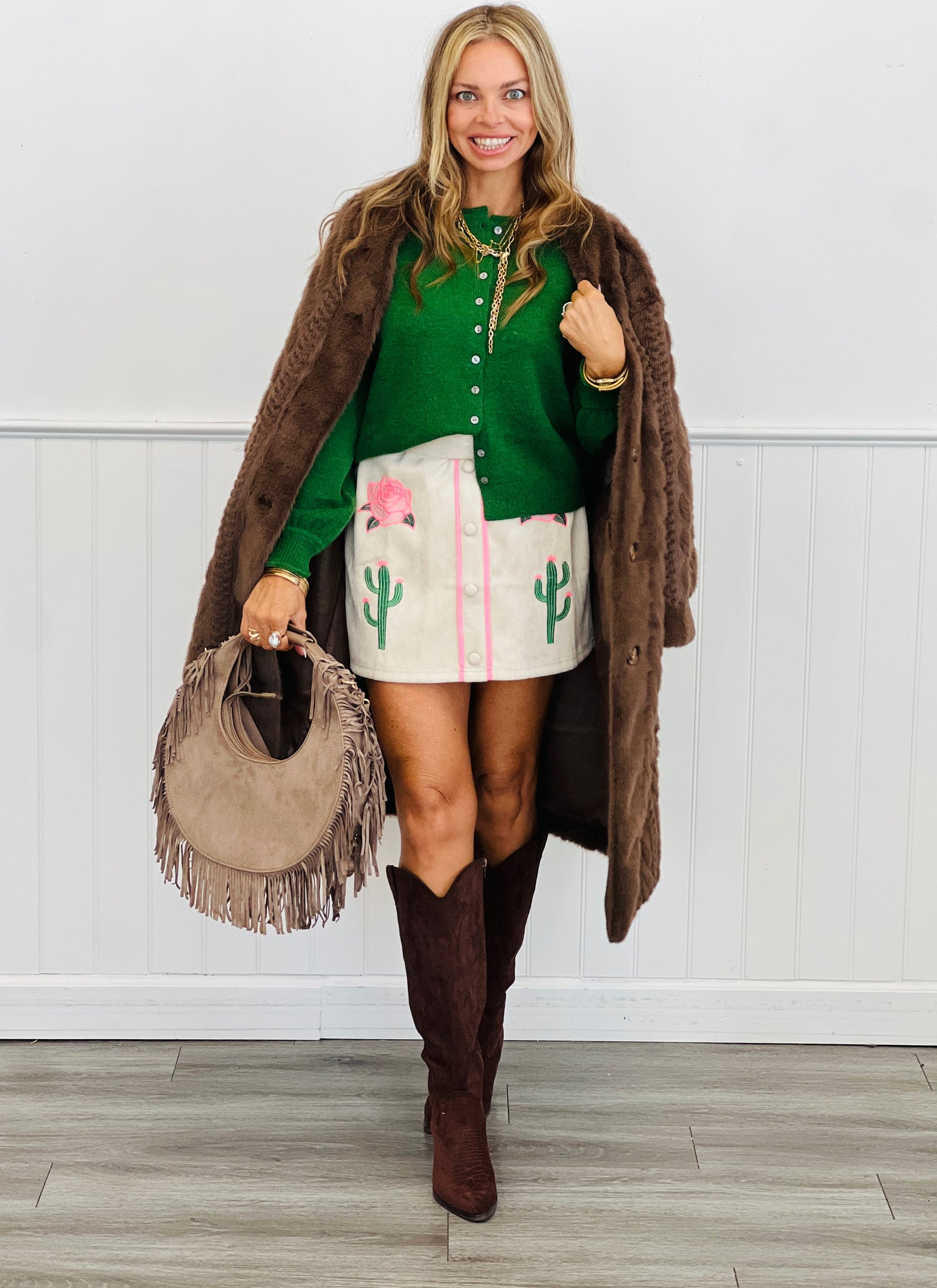 Bring a bit of desert charm to your wardrobe with this suede mini skirt, featuring playful embroidered cactus and floral details. The front button accents add a fun, flirty touch while making it easy to style. Perfect for turning heads at festivals or casual outings, this skirt blends Western vibes with modern flair in both regular and plus sizes.
