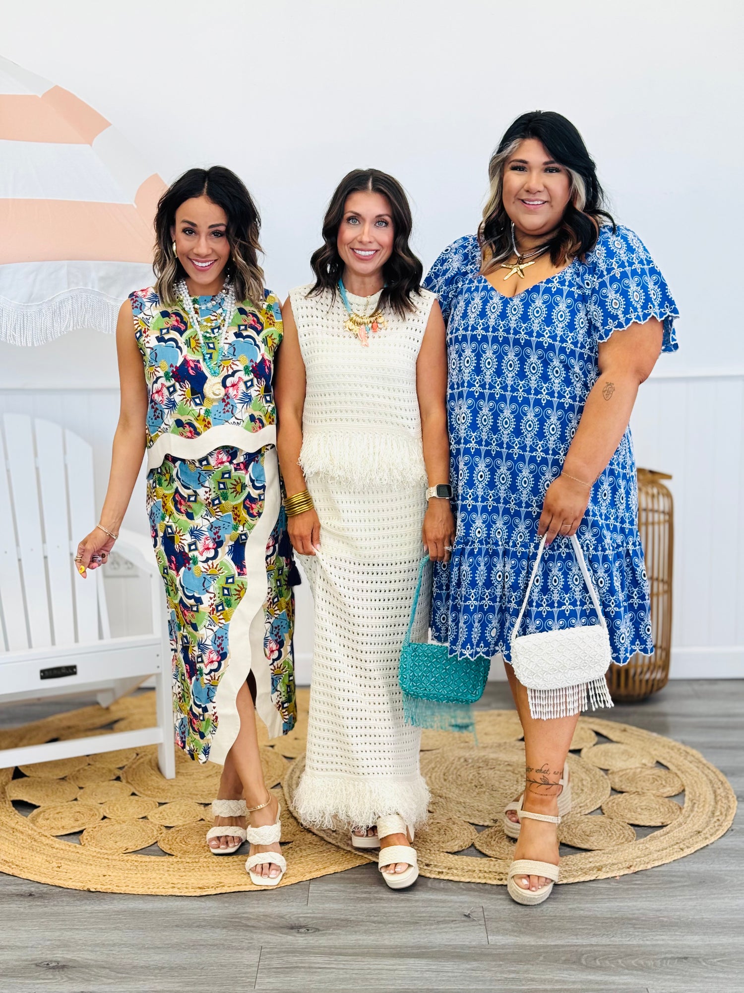 This dress features a striking geometric pattern accented with delicate eyelet details, adding a touch of texture and charm. The flutter sleeves and scalloped hem enhance its feminine appeal, while the relaxed fit ensures all-day comfort. With its flowy silhouette and elegant design, this piece is perfect for casual outings or semi-formal occasions.