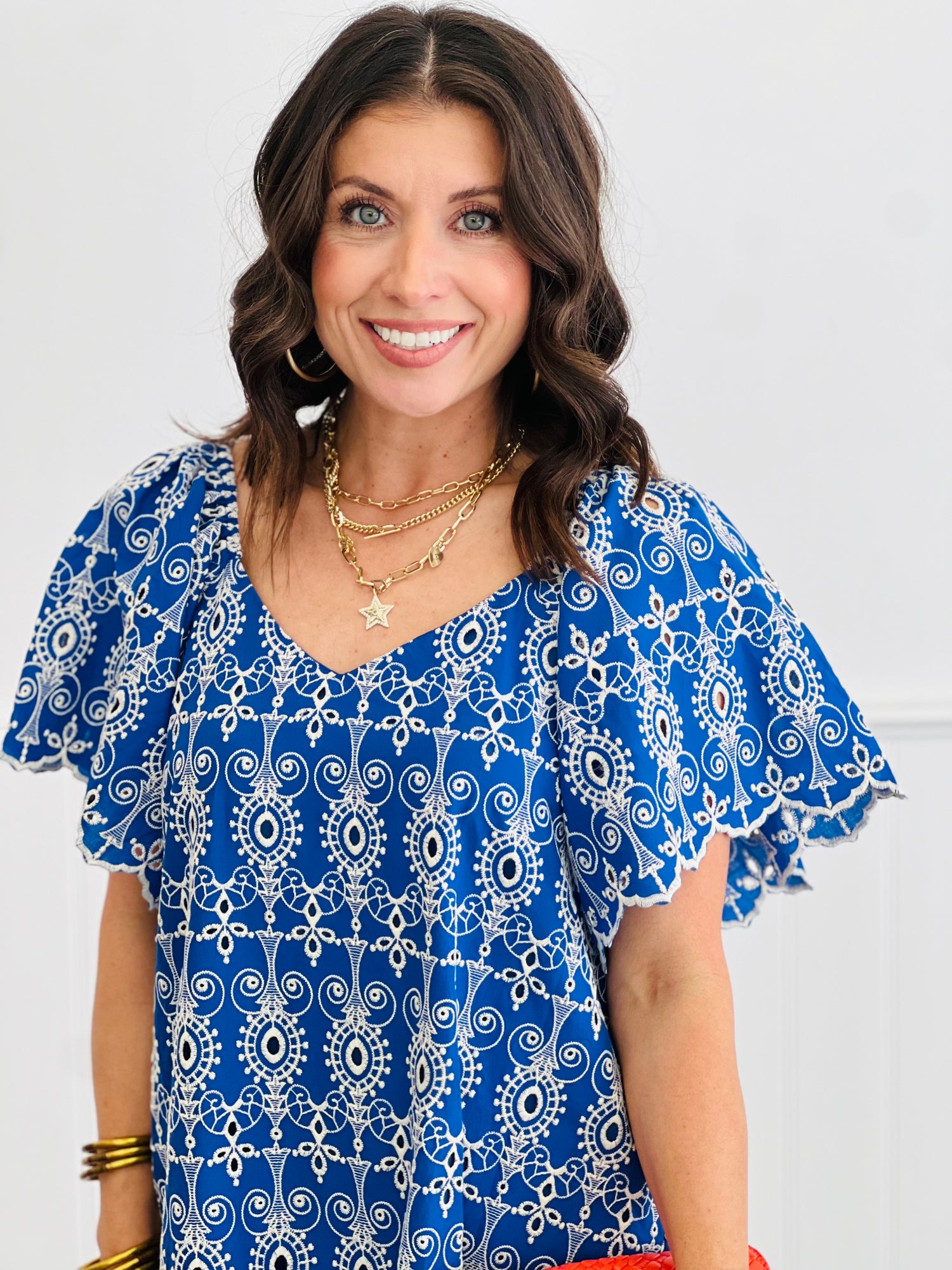 Royal/White Relaxed Eyelet Scalloped Mini Dress (Reg. & Plus)