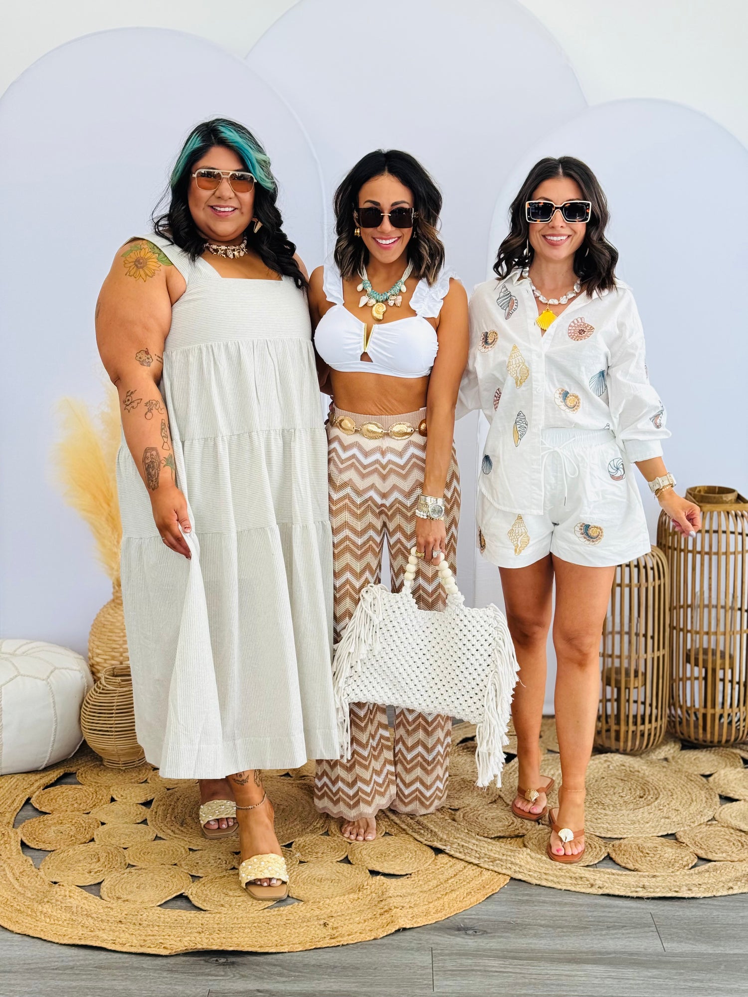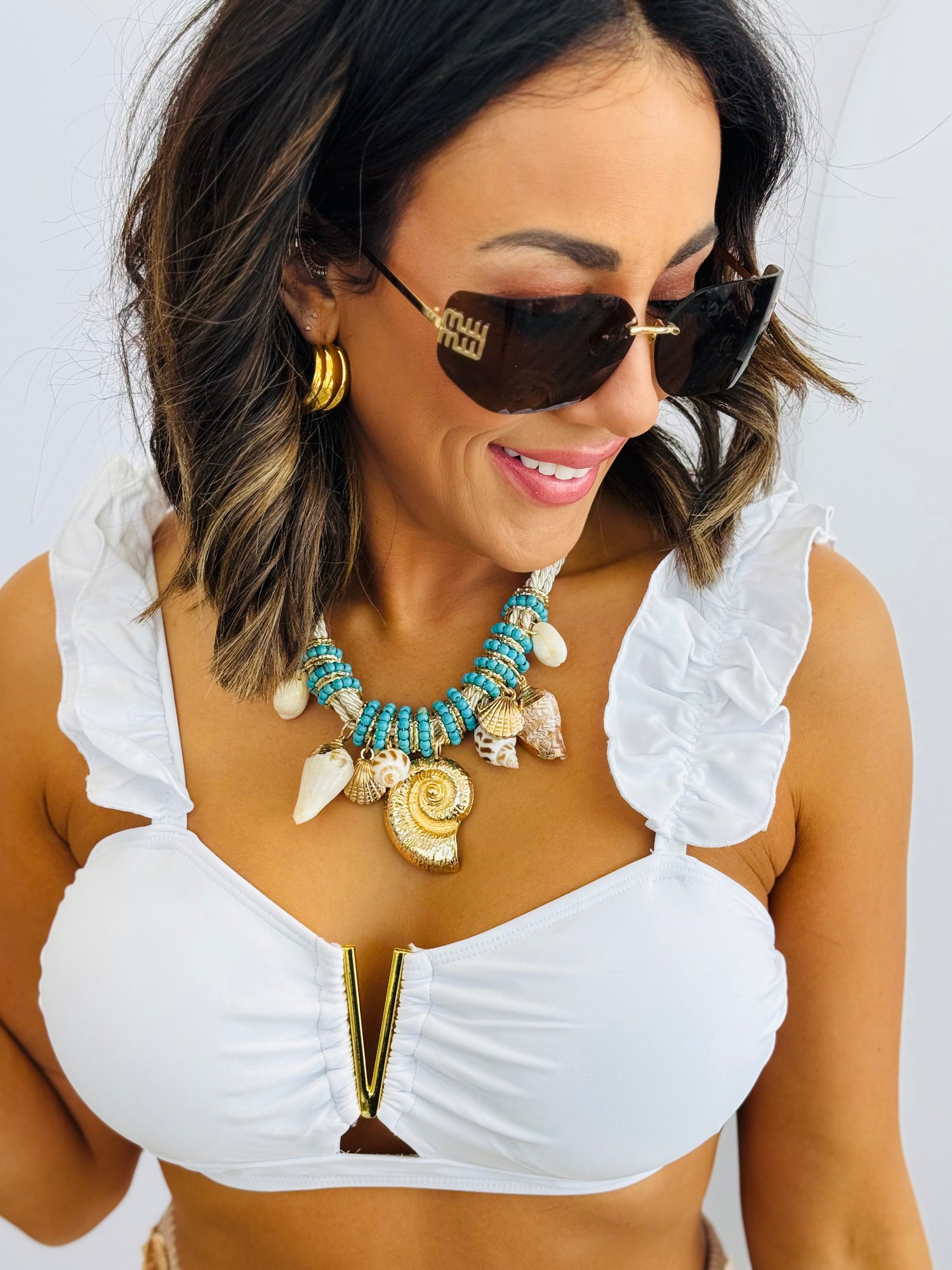 Soak up the sun in style with our white two piece swimsuit! Featuring flutter shoulder straps and a v-neckline with a gold bar, this swimsuit is perfect for a day at the beach. The self tie back adds a unique touch, and the matching bottoms complete the look. Get ready to make a splash in this fun and flirty swimsuit!