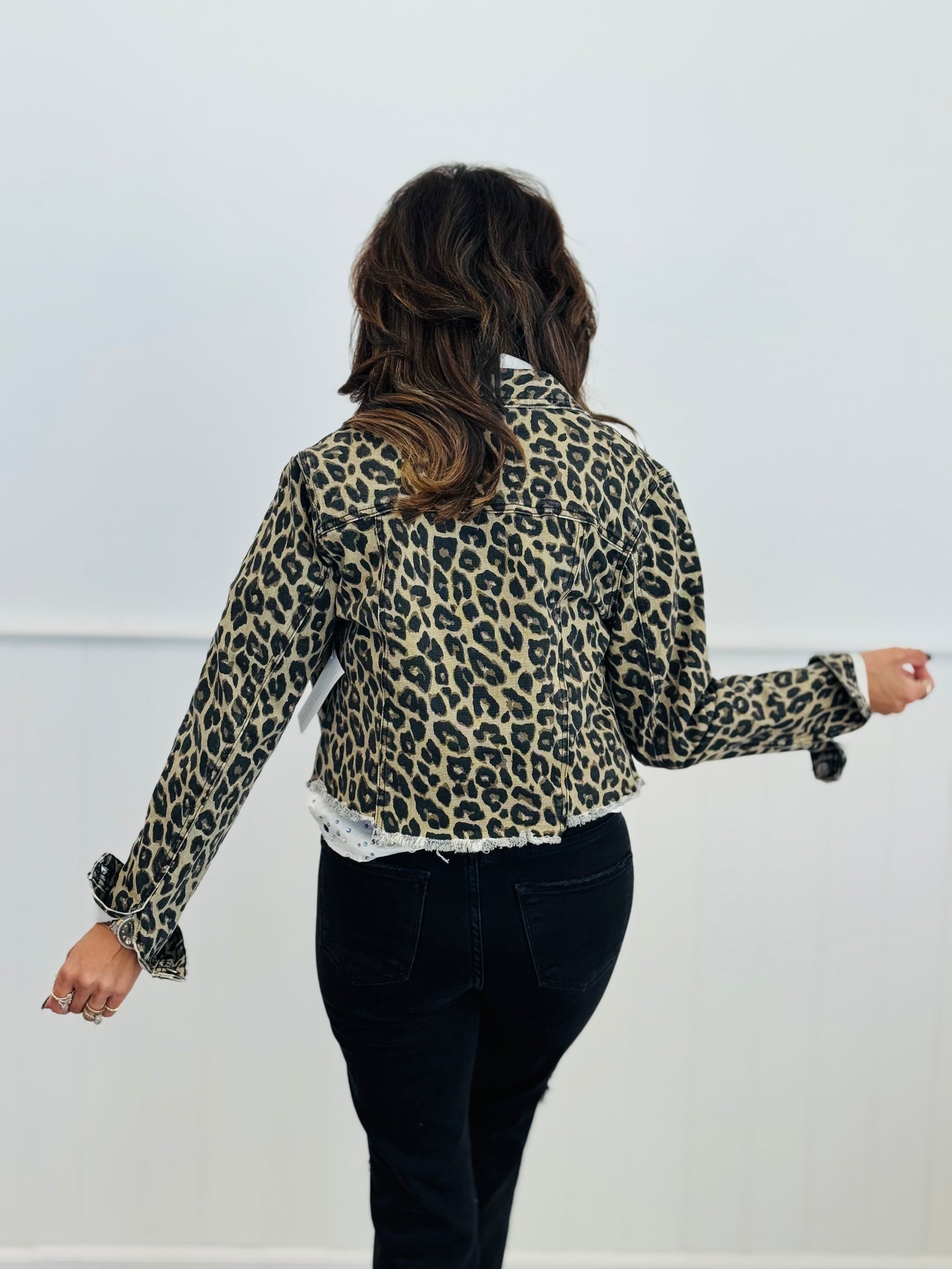 Stay cute and comfy in our beautiful leopard print denim jacket. This is the softest and stretchiest denim jacket that you will ever own, with a fray hem that adds a little distressed edge! Adorable and appropriate for any occasion. Pair this with your favorite tee and leggings, or dress it up for the holidays, or beyond! This is a versatile piece that you need to add to your closet! This jacket is true to size for a tailored fit! This is extra stretchy! You can size up for an oversized fit, but we prefer our true size!
