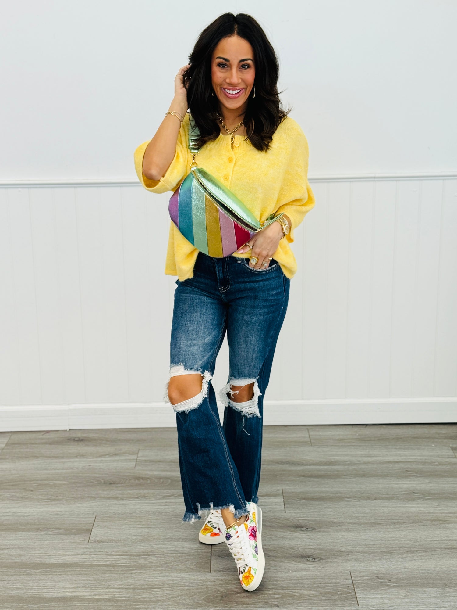 Wrap yourself in cozy comfort with this yellow boxy cardigan that's anything but boring. Featuring a soft brushed knit texture and drop shoulder construction, it's the perfect layer for effortless style. The wide 3/4 sleeves add a fun, relaxed vibe, while the front button closure and ribbed crew neckline keep things polished. Lightweight yet stretchy, this cardigan moves with you all day long—whether you're running errands or settling in for a chill weekend.