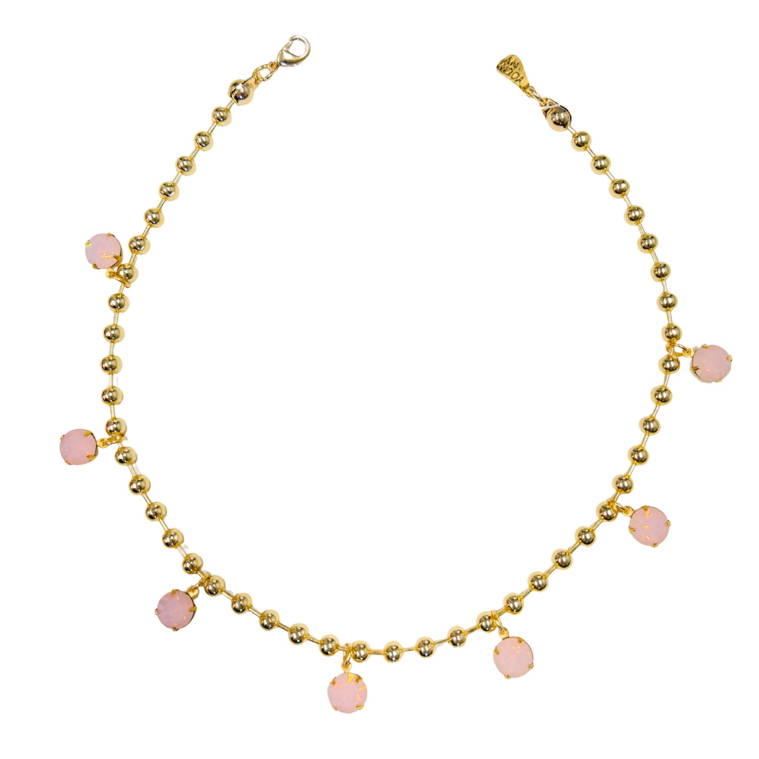Sparkle with every step in this enchanting gold ball chain necklace, where delicate light pink crystals dance along the length for a touch of glamorous whimsy. Perfect for layering or wearing solo, this piece brings just the right amount of shimmer to elevate your everyday look or add pizzazz to special occasions. A playful statement that whispers elegance.