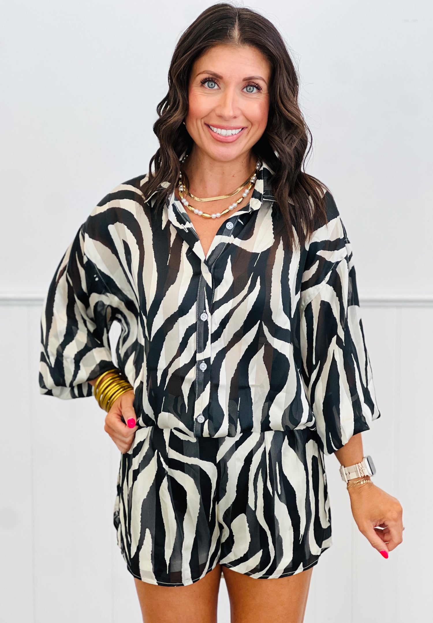 Unleash your inner wild child wearing our black and Ivory Zebra Print Shirt & Shorts Set! Featuring a bold zebra print, this set includes a long sleeved button-down shirt and matching pull-on shorts with elastic waist. Perfect worn together or as separates.
